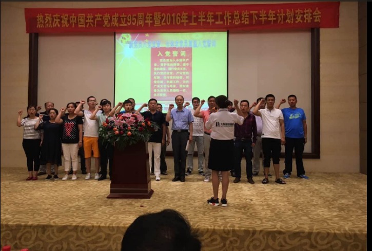 隨著一曲大合唱《沒有共產(chǎn)黨就沒有新中國》,拉開了會議的序幕。在中國共產(chǎn)黨95周年華誕之際,熱烈祝賀我們黨永葆青春!我們的國家繁榮昌盛!公司黨委組織了新黨員宣誓,重溫了入黨誓詞,充分表達了對我黨的熱愛之情。