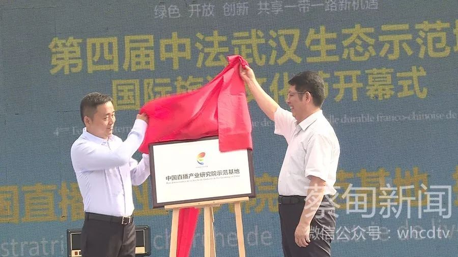 市政府副秘書長雷勇生與武漢閱景匯發(fā)展有限公司董事長徐濤為“中國直播產(chǎn)業(yè)研究院示范基地”揭牌。