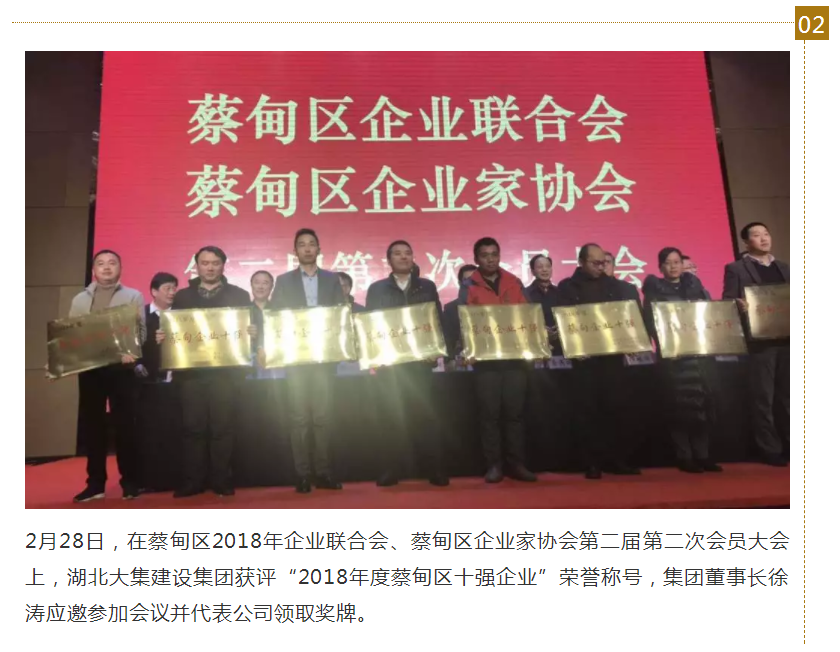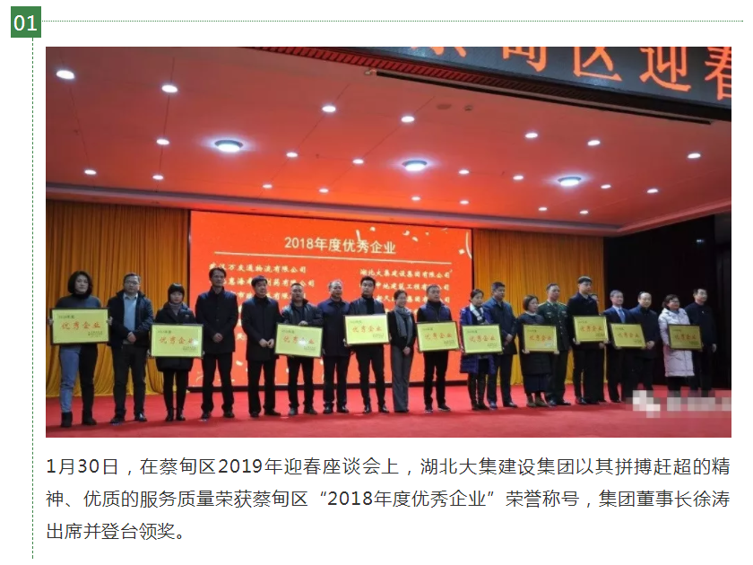 近日,集團(tuán)公司接連受到蔡甸區(qū)人民政府、蔡甸區(qū)企業(yè)聯(lián)合會(huì)的表彰,分別榮獲“2018年度優(yōu)秀企業(yè)”和“2018年度蔡甸企業(yè)十強(qiáng)”的榮譽(yù)稱號(hào),這些榮譽(yù)的獲得充分展現(xiàn)了集團(tuán)公司在依法納稅、優(yōu)質(zhì)工程創(chuàng)建、安全文明生產(chǎn)、信用評(píng)價(jià)等方面的硬功夫,彰顯了湖北大集建設(shè)集團(tuán)的品牌形象與綜合實(shí)力。