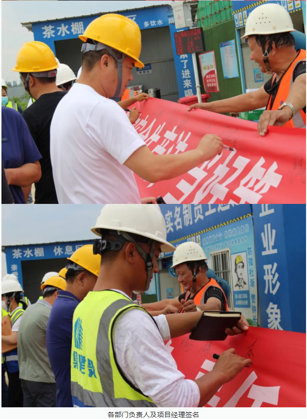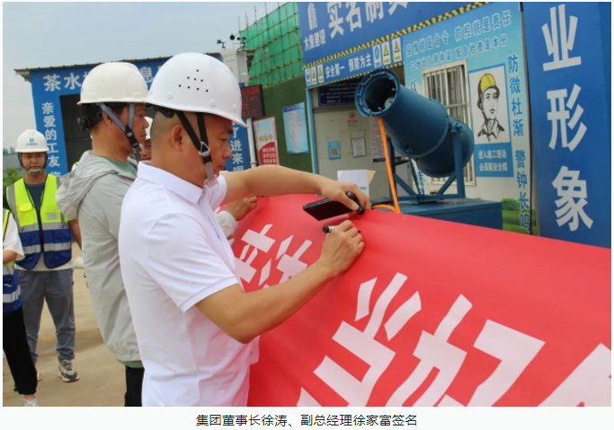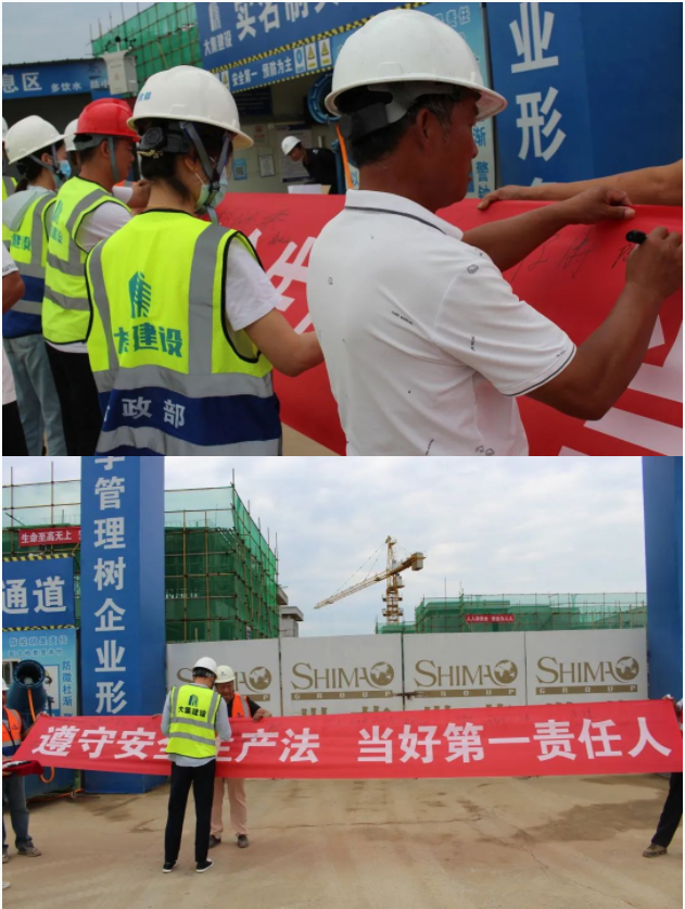 活動(dòng)開始,集團(tuán)董事長徐濤、副總經(jīng)理徐家富及各部門負(fù)責(zé)人、各項(xiàng)目經(jīng)理率先在“遵守安全生產(chǎn)法,當(dāng)好第一責(zé)任人”條幅上鄭重簽名,寫下對(duì)肩負(fù)安全生產(chǎn)責(zé)任的承諾,隨后各項(xiàng)目施工員、安全員紛紛在條幅上寫下自己的名字,表達(dá)對(duì)做好安全生產(chǎn)相關(guān)工作的信心和決心。